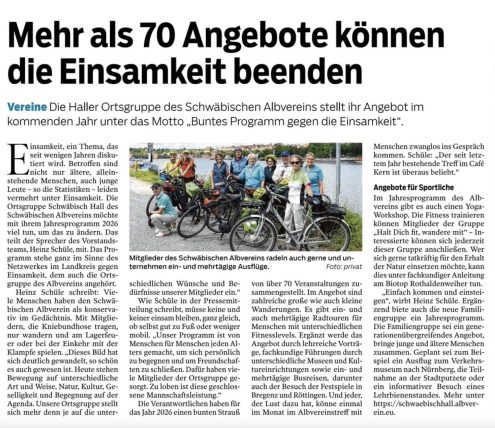 Das Haller Tagblatt hat in seiner Ausgabe vom 27. Dezember 2025 unseren Veranstaltungsplan 2026 vorgestellt. Anbei der Bericht mit freundlicher Genehmigung des HT.