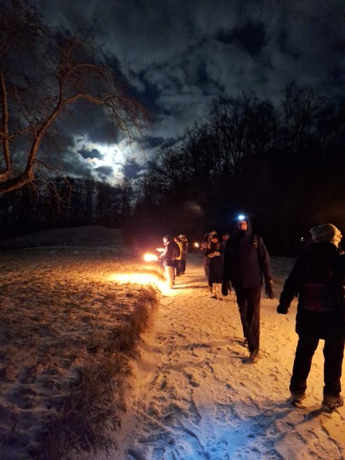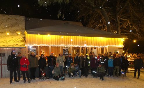 Bei anfänglich leichtem Schneefall wanderte der Albverein Hall mit Mitgliedern und zahlreichen Gästen im Dunkeln vom Bahnhof Hessental hoch zum Einkorn, um dort den Aufgang des ersten Vollmonds im Jahr, des „Wolfmonds“, zu erleben. Tatsächlich lugte der Vollmond immer wieder zwischen den Wolken hervor.