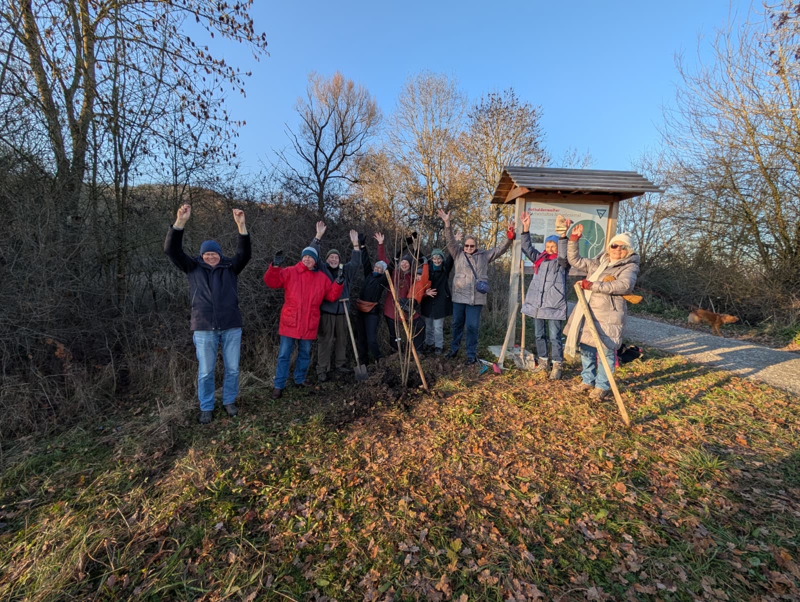 Gerne wurde die Baumpflanzchallenge der Ortsgruppe Mainhardt des Schwäbischen Albvereins von der Ortgruppe Schwäbisch Hall des SAV angenommen. Der Naturschutzwart der Ortsgruppe Frieder Püschel hatte für das Pflanzen eines Vogelbeerbaumes am Rothaldenweiher alles bestens vorbereitet. Für die Betreuung des Biotops Rothaldenweiher hatte die Ortsgruppe im Jahr 2023 den Klimaschutzpreis der Stadt Schwäbisch Hall erhalten.