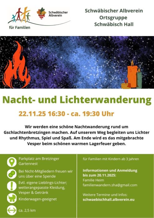 Nacht- und Lichterwanderung (Familiengruppe) Sa., 22.11.2025, Schwäbisch Hall Uhrzeit: 16:30 - 19:30 Ort: Bretzinger Gartennest Am Gartennest 74523 Schwäbisch Hall iCalendar Mit dem Laden der Karte akzeptieren Sie die Datenschutzerklärung von Google.Mehr erfahren Karte laden Google Maps immer entsperren zur Übersicht