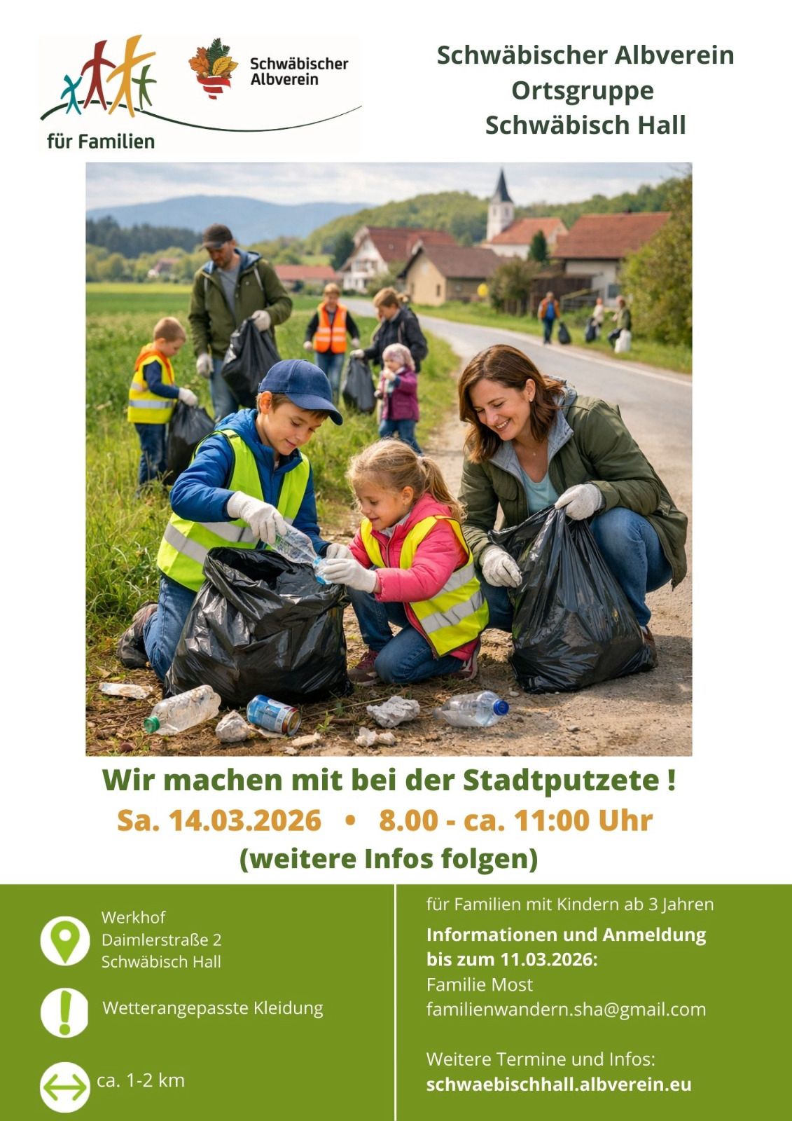 Wir machen mit bei der Stadtputzete (Familiengruppe) Sa., 14.03.2026, Schwäbisch Hall Uhrzeit: 08:00 - 12:00 Ort: Werkhof Stadt Schwäbisch Hall Daimlerstrasse 74523 Schwäbisch Hall iCalendar Mit dem Laden der Karte akzeptieren Sie die Datenschutzerklärung von Google.Mehr erfahren Karte laden Google Maps immer entsperren zur Übersicht